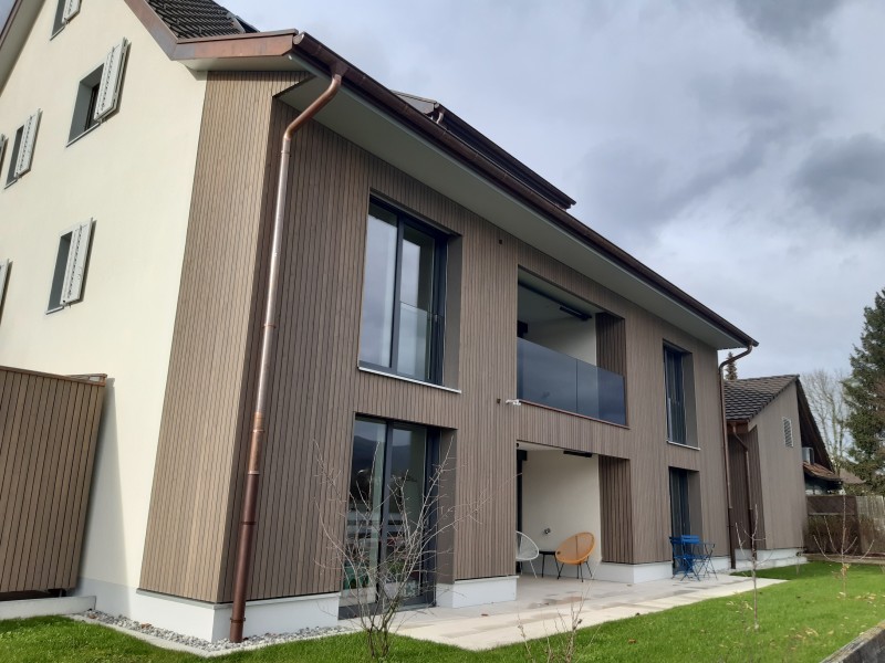 Wir bieten Ihnen eine Vielzahl an Gestaltungsmöglichkeiten, um Ihrem Gebäude einen individuellen Charakter zu verleihen. Dabei kombinieren wir modernes Design mit langlebigen Materialien. Selbstverständlich ist auch im Holzbau eine klassische Fassade mit Fassadenputz möglich. Es muss nicht immer auf den ersten Blick erkennbar sein, dass eine Holzkonstruktion dahinter steckt. Es gibt zahlreiche Varianten von Holz über Verbundwerkstoffe bis zu mineralischen Baustoffen, von kleinen, geschuppten Formaten bis zu grossformatigen, flächigen Platten.