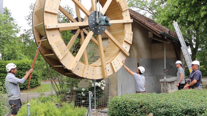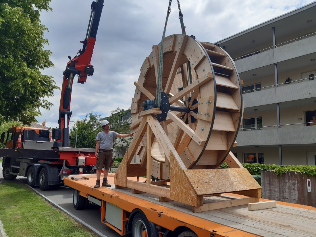 Dank langer Recherchen über die korrekte Konstruktion und sehr engagierten Mitarbeitern gelang uns das 3,2 m hohe Eichenrad. Der Einbau des 1`700kg schweren Rades – per Kran und mit präziser Handarbeit – war eine echte Herausforderung, die uns viel Freude bereitet hat.