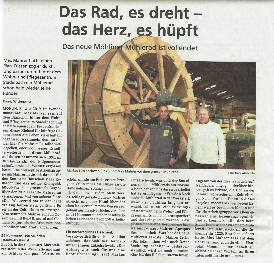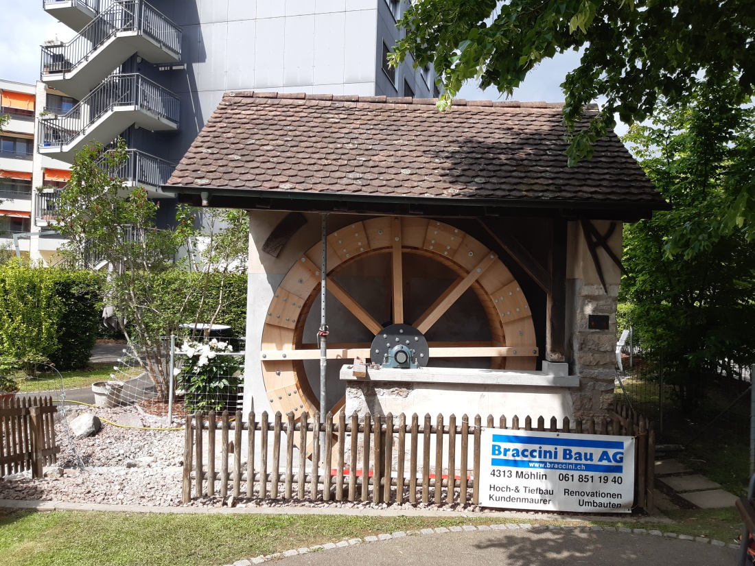 Anlässlich des Jubiläums „1225 Jahre Möhlin” durften wir im Jahr 2019 das dreissigjährige Mühlerad beim Altersheim Stadelbach ersetzen.